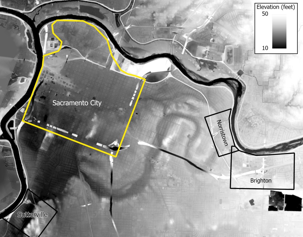 No Norristown maps are yet known to survive, but an 1853 depiction of its successor town shows that this was a stable settlement for at least a few years, with persistent development on at least two blocks. While Hoboken is usually recalled as a fleeting tent city that faded as soon as the waters dropped, several permanent buildings line the Norristown side of a great wedge-shaped commons that once occupied a swath of the modern Sac State campus.
