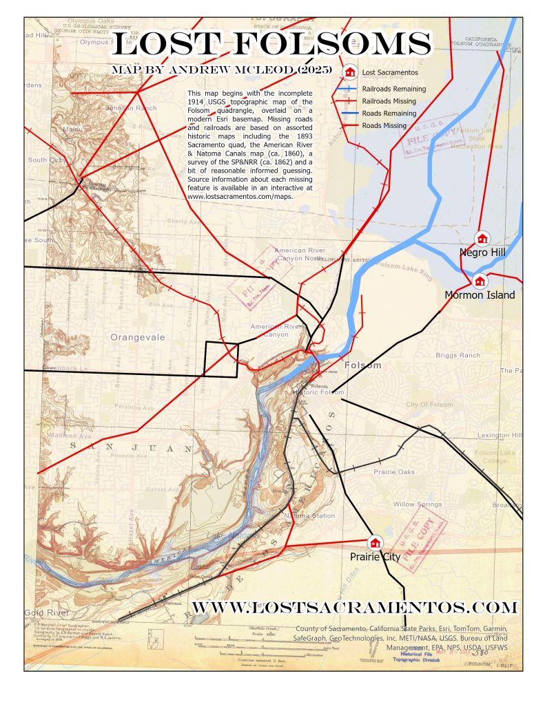 Folsom is an area of particular interest, with numerous signs of disturbance. The following new map shows a missing transportation system, centered around the Sacramento Valley Railroad shops complex – which employed 1500 people and served no fewer than five railroads in the early 1860s. The creation of Folsom Lake certainly helps explain some disruptions, but other disappearances are more puzzling. Most notably, the lack of connection to Roseville seems connected to other lost routes to Auburn, which appear to have been severed at the county line. In any case, a large swath of land was apparently unmappable as late as 1914, suggesting that the USGS could not decide how to handle whatever traces remained from the previous network of roads and rail. More information about the routes shown herein is available in this bibliographic map.